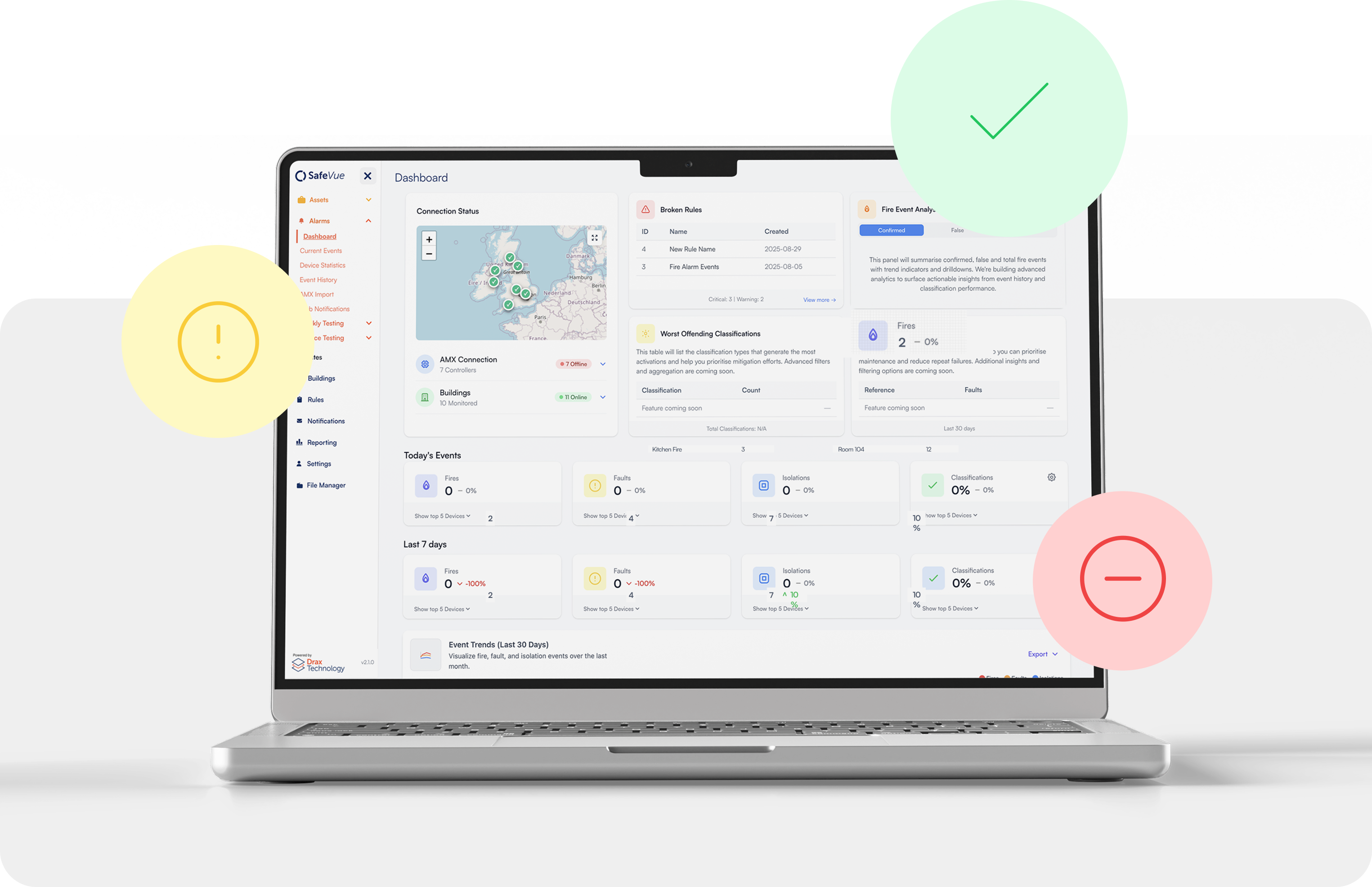 Live visibility of fire, security, and life safety systems across every site - status, faults, activations, and outstanding actions.